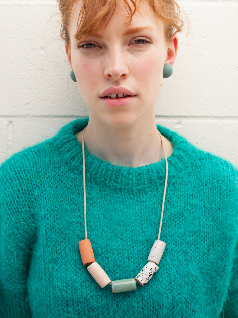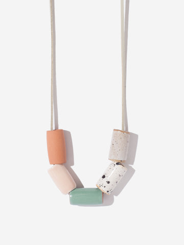 Our Signature ceramic bead necklaces feature tried and true combinations from our collection of hand made beads. Seafoam is the focal point color here, balanced with a glossy neutral blush and other textured earth tones. Finished on a tan colored cord. Beads are individually shaped by hand imbuing an unmistakable human quality.