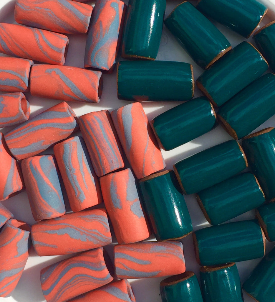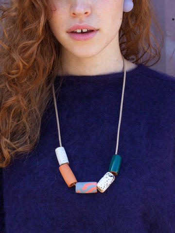 Our Signature ceramic bead necklaces feature tried and true combinations from our collection of hand made beads. Coral paired with teal is the color focal point color here, balanced with other textured earth tones. Finished on a tan colored cord. Beads are individually shaped by hand imbuing an unmistakable human quality.