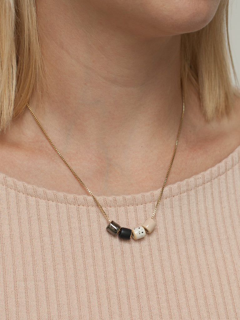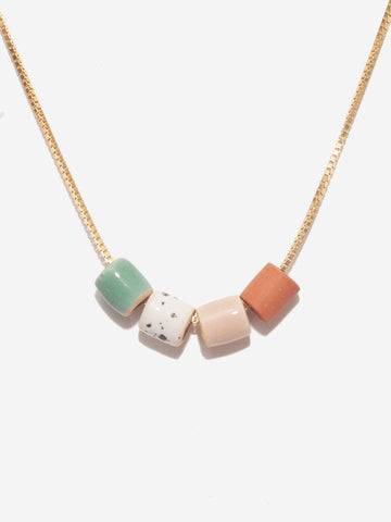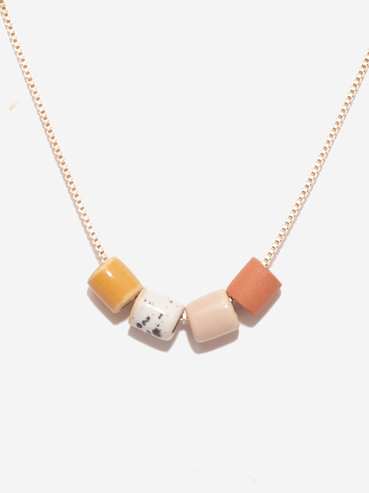 Our hand formed ceramic beads on a miniature scale. Choose from Mustardy yellow or Seafoam color pairing. Beads are individually shaped by hand imbuing an unmistakable human quality. Finished on a quality 14kt gold-filled chain.